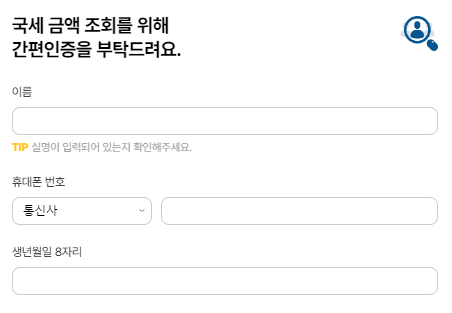 간편 인증은 국세청 홈텍스에서 정확한 국세를 조회하기 위해서 필요합니다. 단 정확하게 국세 금액을 알고 계시다면 해당 인증을 건너뛸 수 있습니다.
