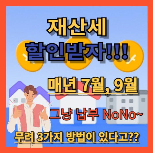 재산세 납부하는 기간이 언제인가요? 매년 7월과 9월입니다. 매년 내는 세금 조금이라도 할인받는 방법이 있지 않을까 하는 생각에 재산세 할인받는 방법에 대해서 포스팅하겠습니다. 끝까지 읽어 주시면 감사하겠습니다.