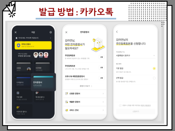공공문서를 발급 받기 위해 방문(주민센터)하여 소중한 시간을 침해하지 않고 수수료 없이 카카오톡으로 발급 가능합니다. 이는 카카오의 대표가 행정안전부와 협업을 통하여 '지갑 전자증명서' 서비스를 오픈하였기에 가능했습니다.