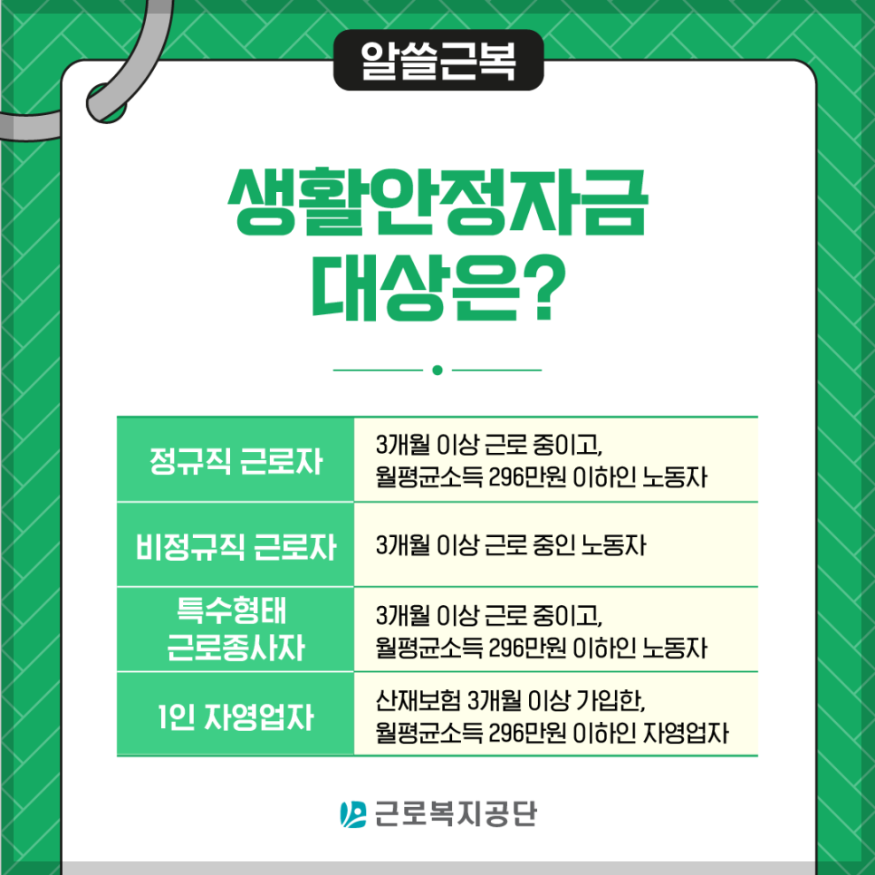 생활안정자금 대상은 위의 표에서 확인할 수 있는 것처럼정규직 근로자, 비정규직 근로자, 특수형태근로종사자, 1인 자영업자 총 4가지 유형으로 나눌 수 있습니다.